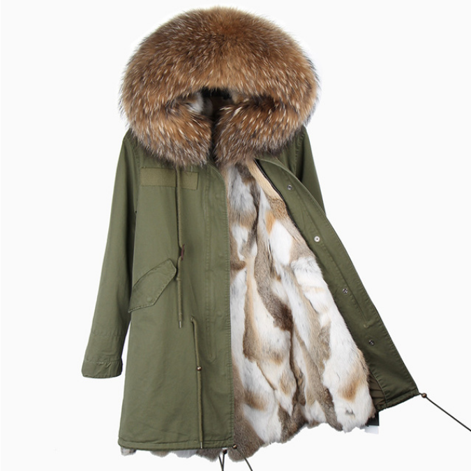 Außen überzeugt die Winterjacke gekonnt durch ihr elegantes Design. Gefüttert ist der Parka aus edlem Kaninchen-Fell, das euch auch an den kältesten Tagen noch richtig warm hält.